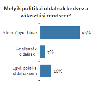 - A megkérdezettek többsége tudja/érzi, hogy a 2011-ben elfogadott választási rendszer még a korábbinál is jobban kedvez a mindenkori legnagyobb pártnak. de még ennél is elterjedtebb az a vélekedés, hogy a kormányoldal a haszonélvező: 59 százalék szerint ez a helyzet, míg mindössze 7% szerint az ellenzéki oldal a kedvezményezett. Részrehajlástól mentesnek csak 16% gondolja a választási rendszert, ami talán az egyik legszimptomatikusabb adat a teljes kutatásban.